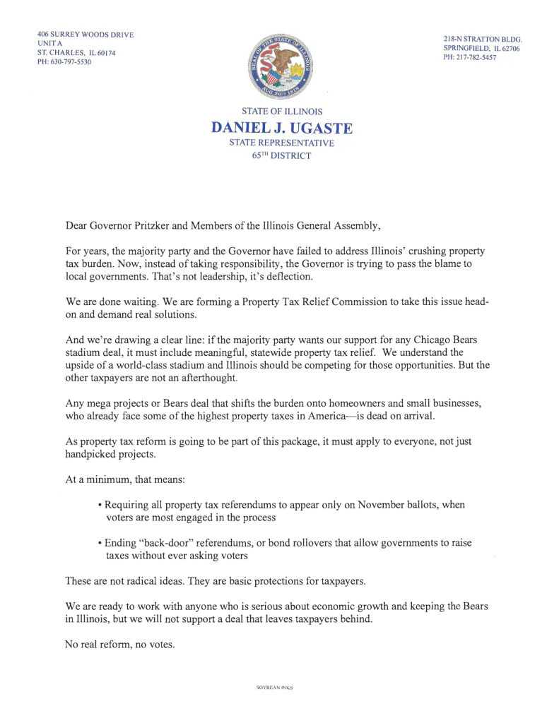 Springfield, IL – State Representative Dan Ugaste and other House members today announced the formation of a Property Tax Relief Conference and released an open letter outlining what it will take to earn their support for any Mega Projects bill or PILOT legislation to keep the Chicago Bears in Illinois.