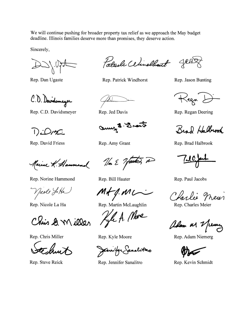 “For too long, Illinois families and small businesses have been crushed by high property taxes while Governor Pritzker and House Democrats have failed to act,” said Ugaste. “Time and again, we have heard lip service about property tax relief, but no real solutions have followed. We are done waiting.”